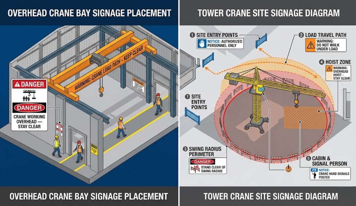 This guide covers crane signage for construction sites and fixed industrial facilities operating under OSHA 29 CFR 1926 Subpart CC and 1910 general industry standards. It does NOT address marine crane operations, offshore rigs, or jurisdictions outside U.S. federal OSHA authority.